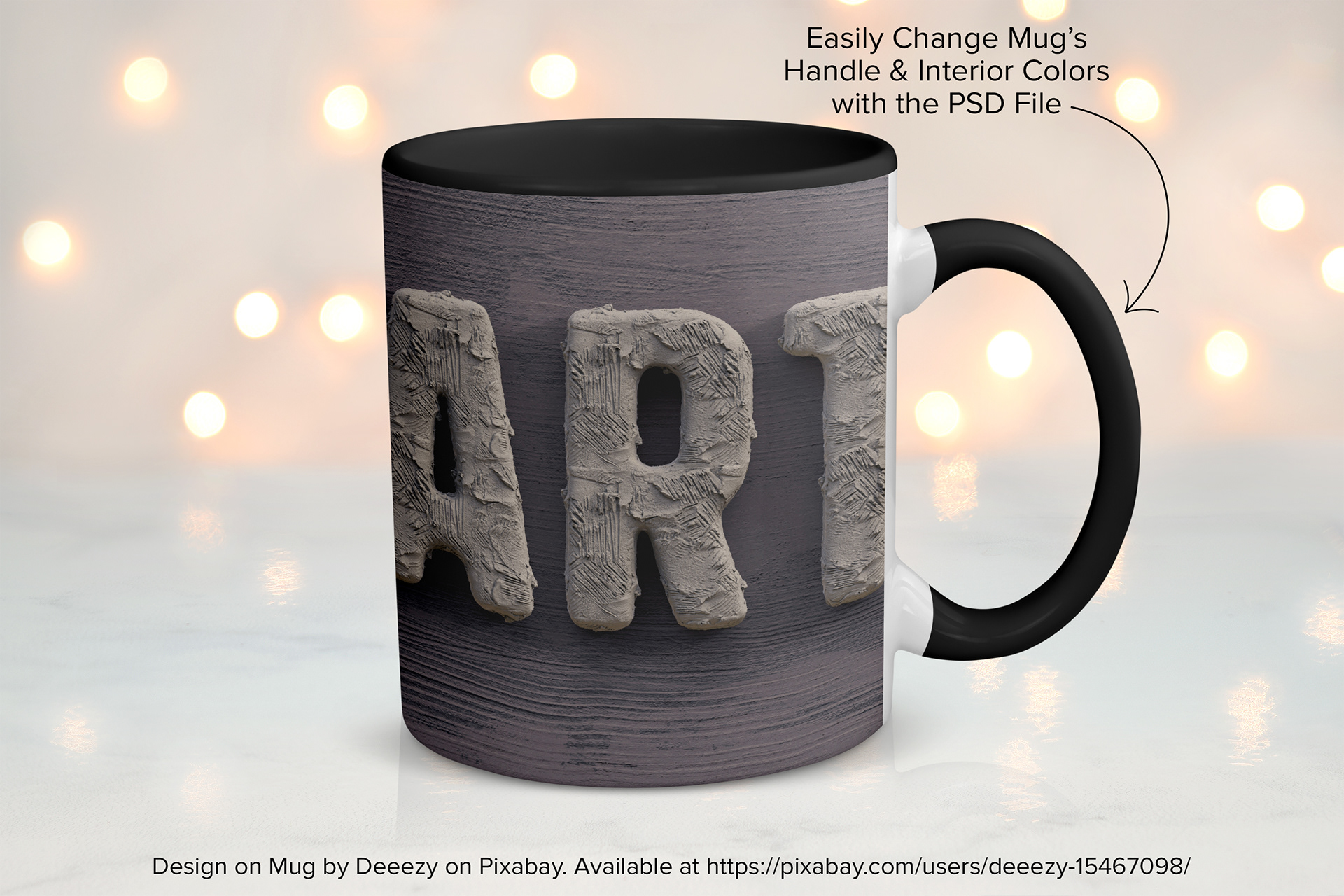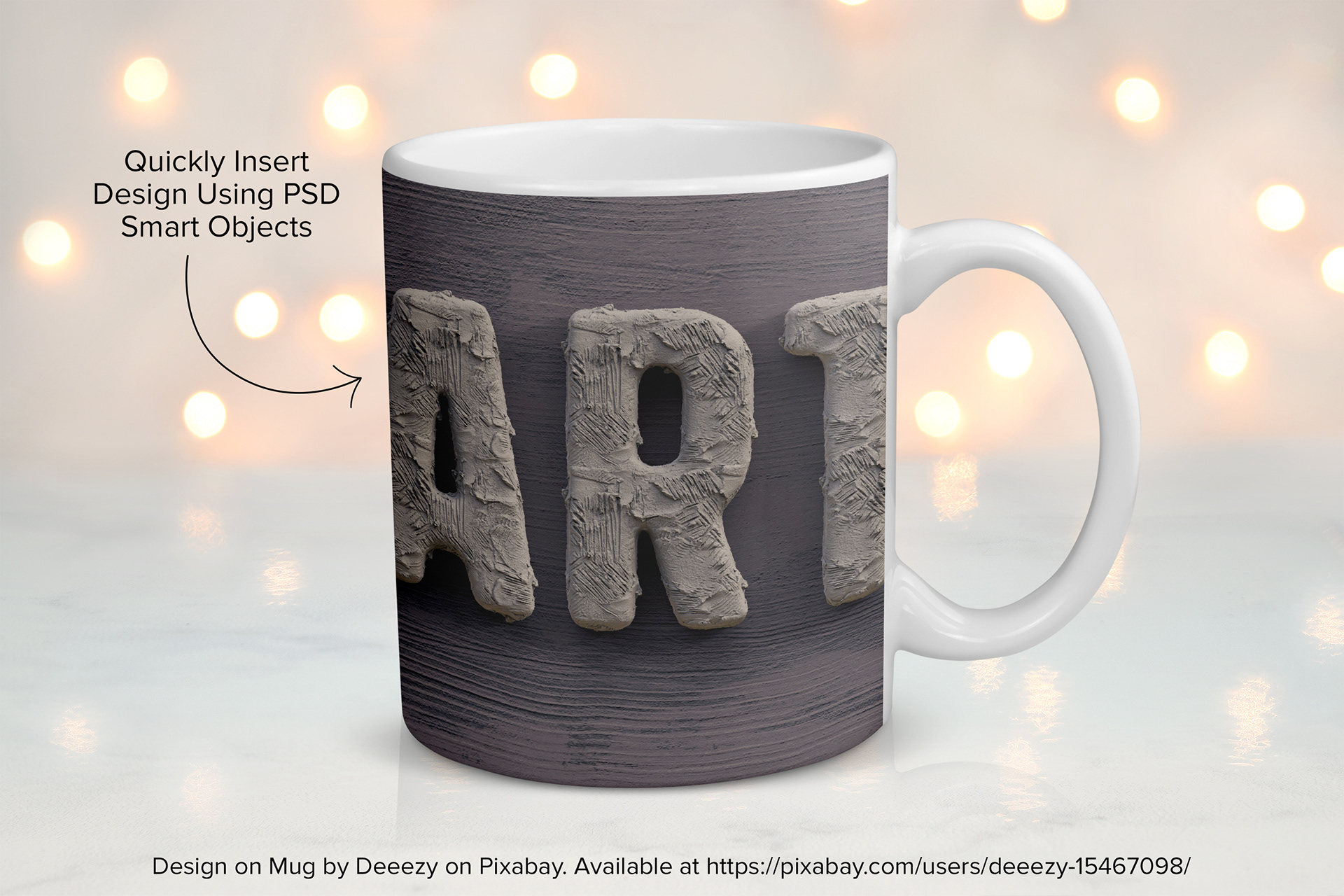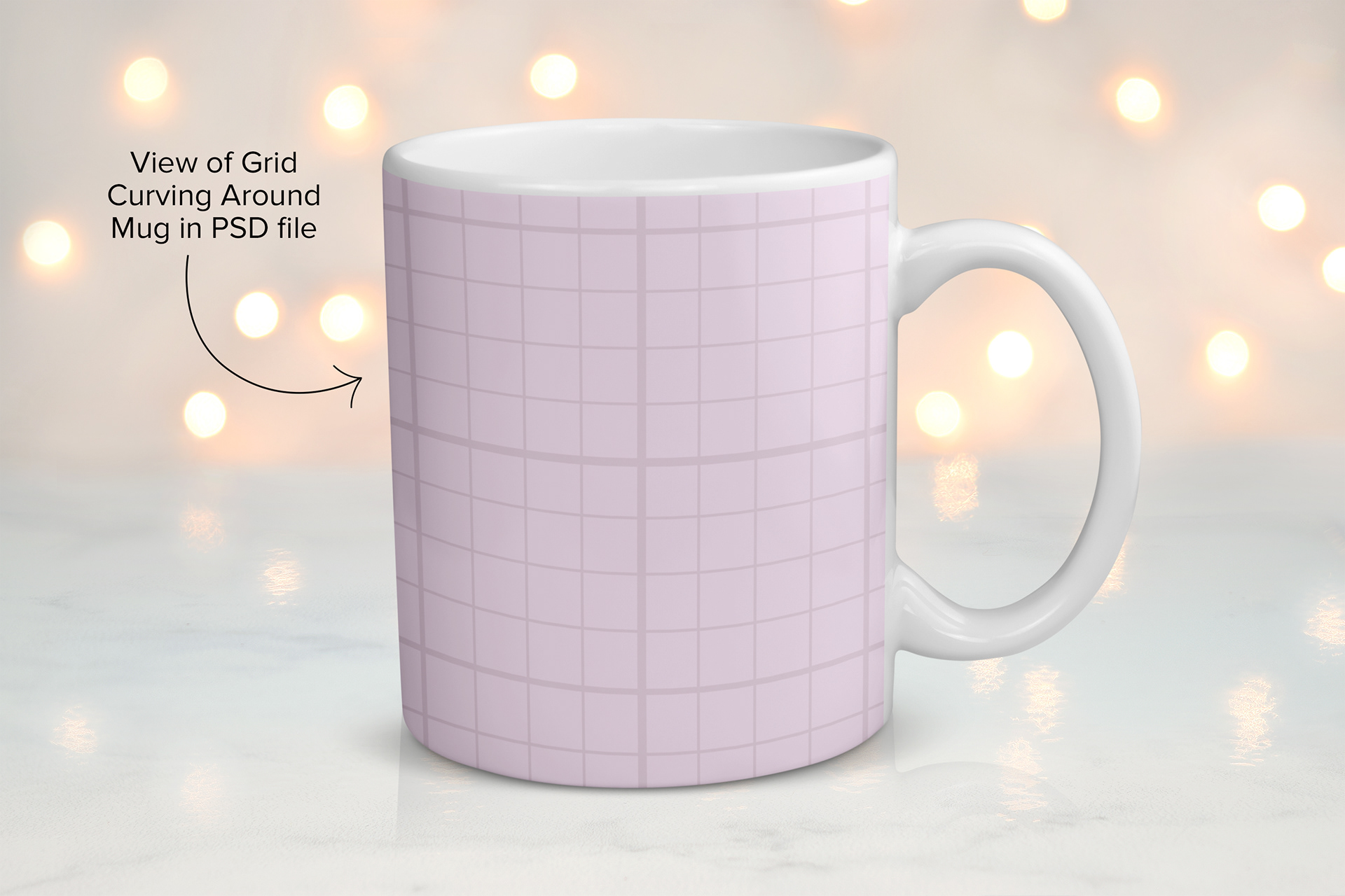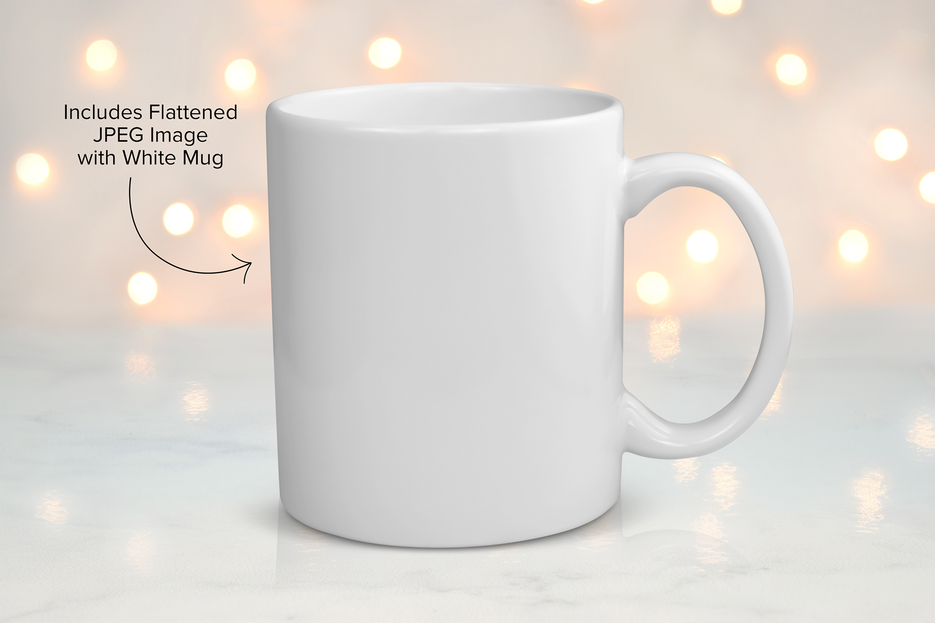 11 oz. White Coffee Mug Mockup filled with glowing bokeh lights.