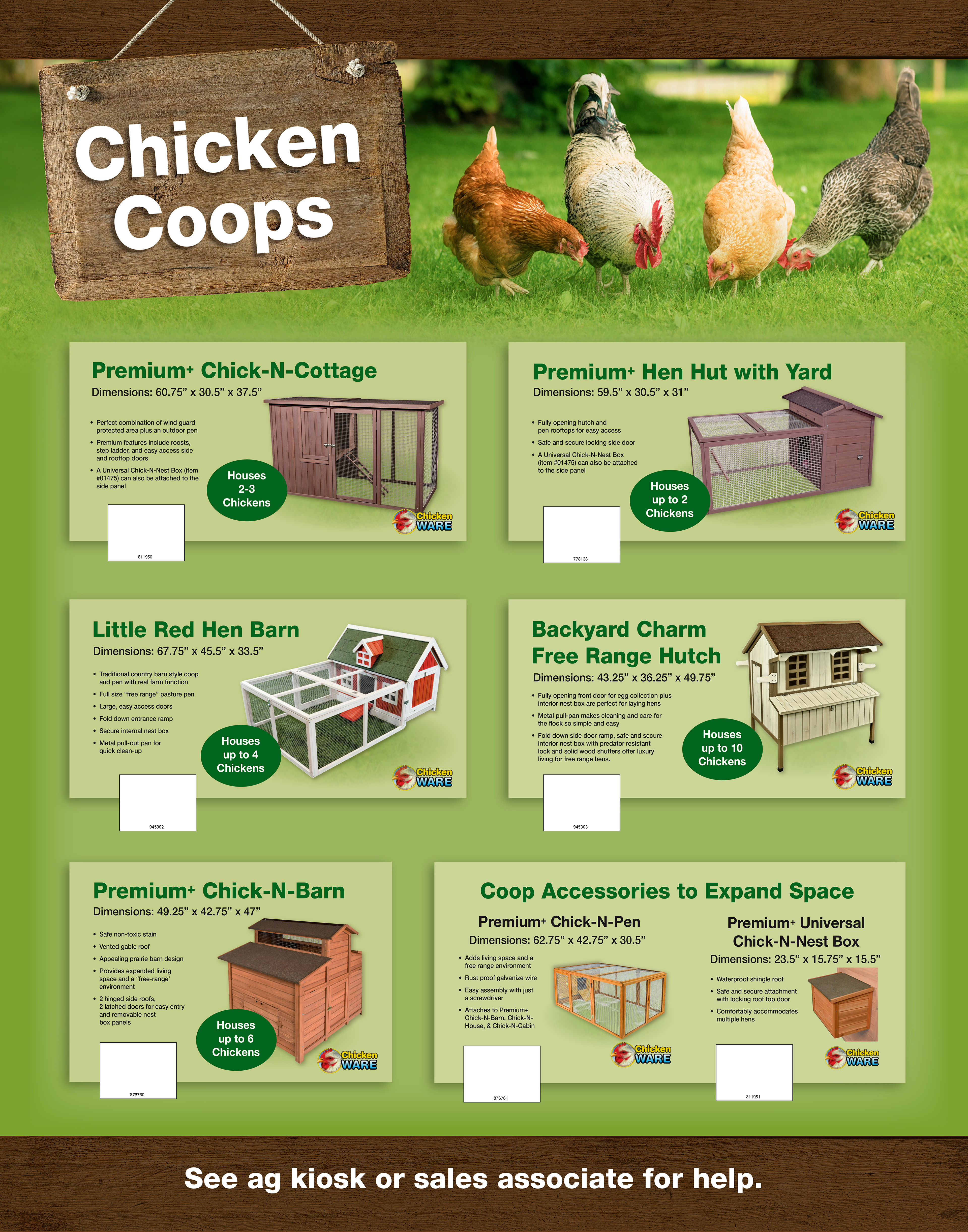 Chicken Coop sign designed to catch customers' attention and show them the features of the various chicken coops.
