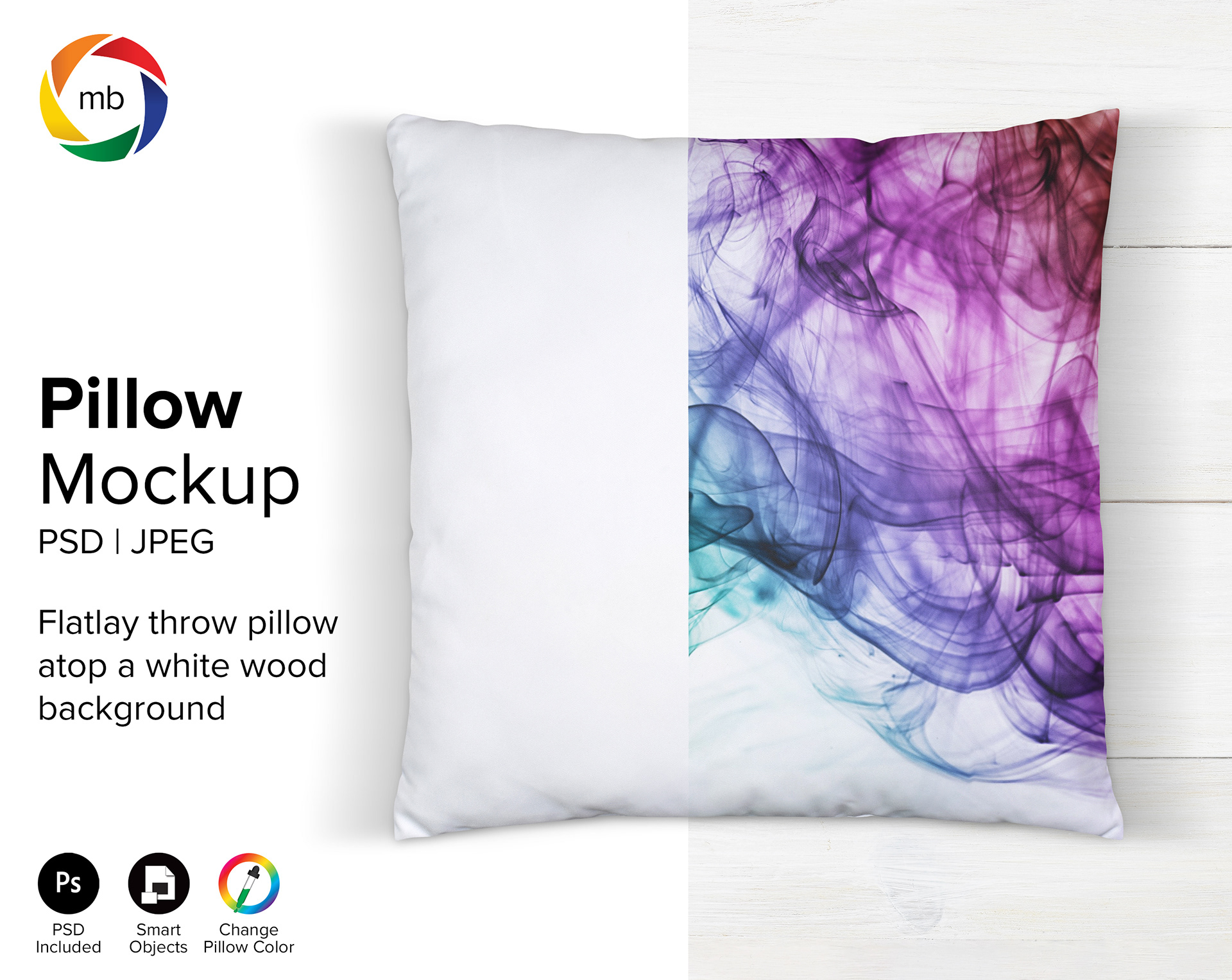 Modern Pillow Mockup on a chic white wood background. Mockup includes a PSD with smart objects and a JPG for those who don't do PSD.